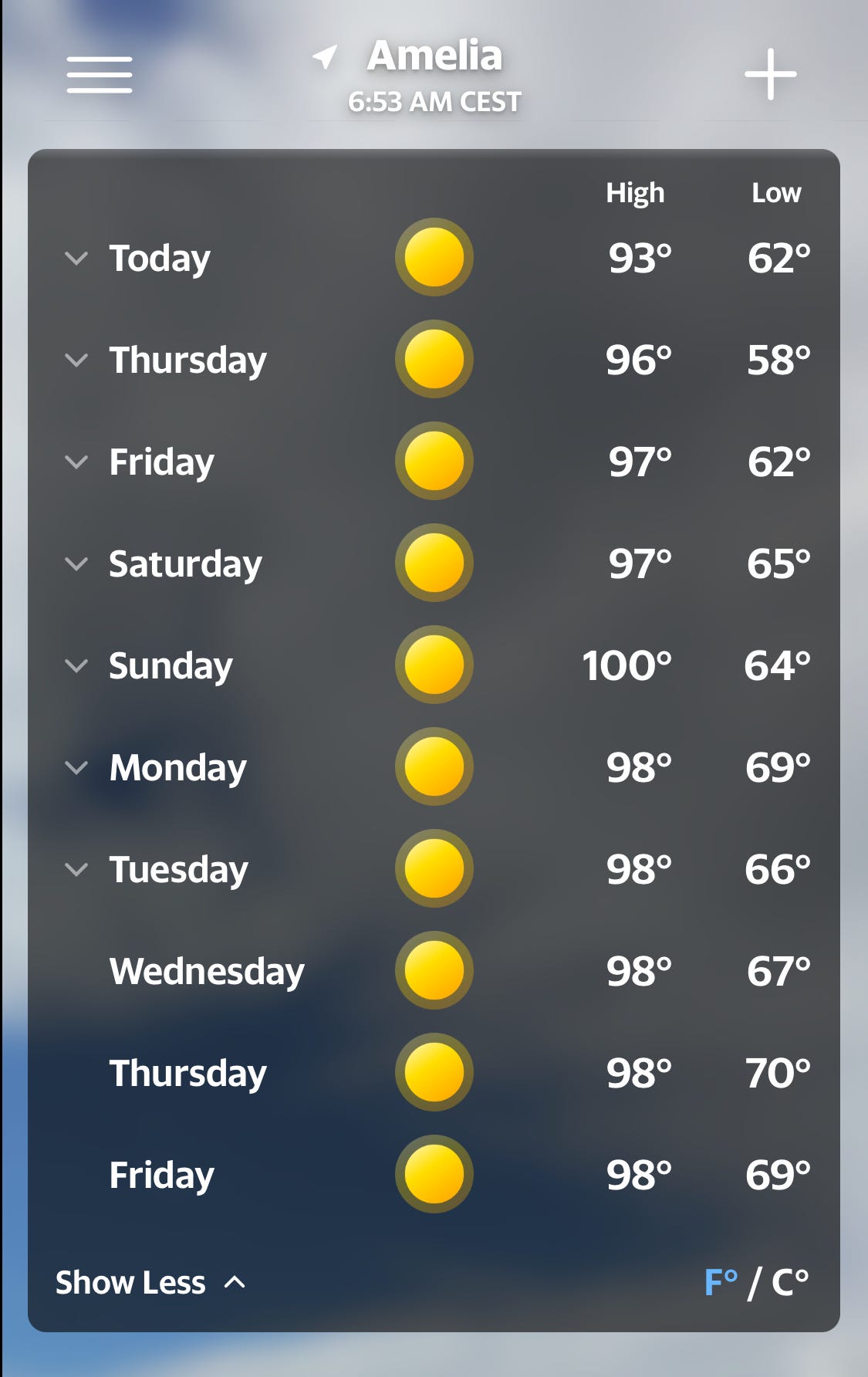 If you move to Europe, it is unlikely you will find a house or apartment with central air conditioning. Europe simply doesn’t have it. And it’s not as though the barometer doesn’t reach sweltering temperatures here. Behold the forecast this week for Amelia, which is in the Umbria region of Italy—not even the hottest part of the country.