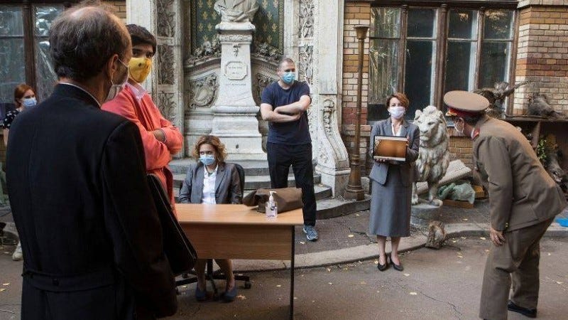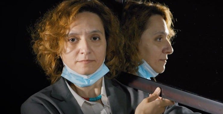 The premise is this: Emi Cilibiu (brilliantly acted by Katia Pascariu) is a history teacher at a well-respected Romanian junior high school. On a lark, she does an amateur porno with her husband, Eugen, who naively (?) uploads the video to a private site, where it quickly goes viral. Her students’ parents soon discover her “immoral conduct” and pressure the staff at Emi’s school to fire her. The movie itself, which is structured into three acts separated by hot-pink title cards, ends with Emi being pilloried at a Covid-aware, socially distanced, outdoor parent-teacher conference where every awful, misogynistic name is thrown at her. Emi’s contention—that what she does in her private life has no effect on her work as a teacher—falls on deaf ears.