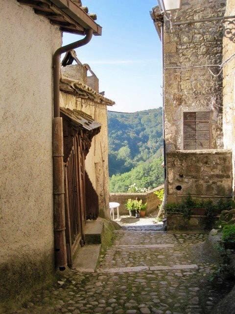 The first time I saw Calcata was on a writers’ retreat in Italy. The organizer had chartered a bus, and as we rounded the curve of a mostly one-lane mountain road, the clouds parted and a ray of sunshine poured out of those Renaissance skies, illuminating a tree-filled valley. A medieval village was perched on a fist of volcanic rock that rose high above the valley floor, its base festooned by drifts of fog.
