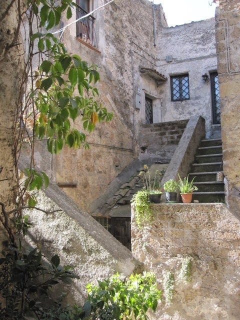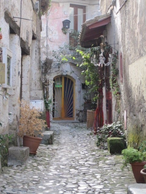 Eventually, lack of living space, humid conditions, and the inconvenience of living in Calcata prompted us to move about fifteen kilometers away where people are decidedly not crazy, but perhaps not as interesting either. Schlepping flats of water up those slippery cobblestones wore on us, as did the constant noise. Calcata Vecchia has no bank, post office, or grocery store. And there comes a point where one longs to wake up without the sound of people screaming.