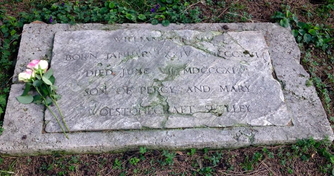 Shortly after July 8, 1822, little Willmouse was joined by his illustrious father, Percy Bysshe Shelley, who died in a tragic boating accident in Livorno. His ashes were interred beneath a dedicational stone erected by his friend, Edward Trelawney, whose own memorial sits adjacent. Poor Willmouse’s final resting place is far away, an afterthought. I cannot imagine these were the wishes of his mother, whose heartache and depression after her son’s death inspired Shelley to write: