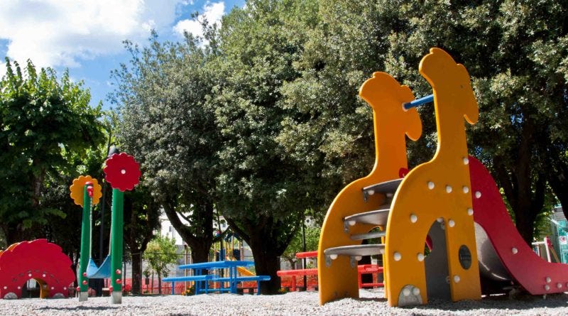 I live in Amelia, a village in Umbria four hundred years older than Rome. Right outside its ancient walls lies a lovely tree-shaded public park, kitted (or should I say “kidded?”) out with play equipment for the youngsters. In the center is a coffee-and-aperitivo bar flanked by tables. And on any night during the summer, hundreds of people gather there to cheer soccer games on the outdoor big screen, enjoy a glass of wine, watch their kids play, but mostly just to talk.