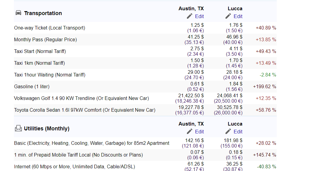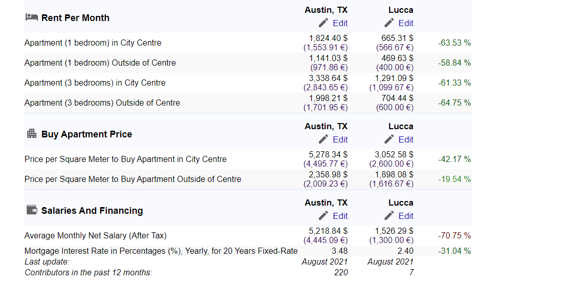 So, too, Austin, Texas. West Virginia is half as pricey, but I doubt anyone from West Virginia is curious about doing a cost analysis of the U.S. versus Italy, so here we go.
