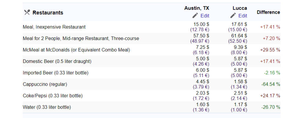 Restaurant Prices in Lucca are 4.80% higher than in Austin, TX.