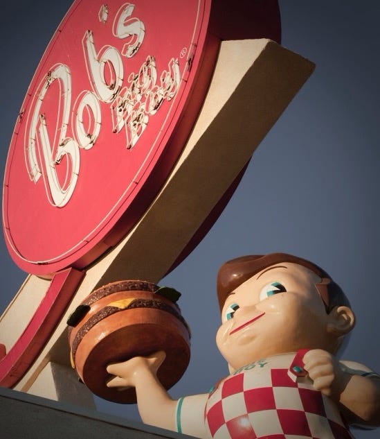 Despite the kitsch, Bob is capitalism run amok. He’s the brightly lit carnival at the end of a dark road. He’s old-timey Coca-Cola with the cocaine in it. Year after year, as we grow up, have kids of our own, and then dwindle into obsolescence, Bob never changes. He’s a fossilized meat patty trapped inside the couch cushions when a takeout dinner turns into a make-out sesh. He’s always there, proffering the double-decker hamburger in coy invitation: a sesame-seed bun top, Big Boy sauce, quarter-pound beef patty, more Big Boy sauce, a toasted mid-bun, quarter-pound beef patty, one slice American cheese, lettuce, a generous slathering of Big Boy sauce, 1 1/2 inch toasted bun bottom.