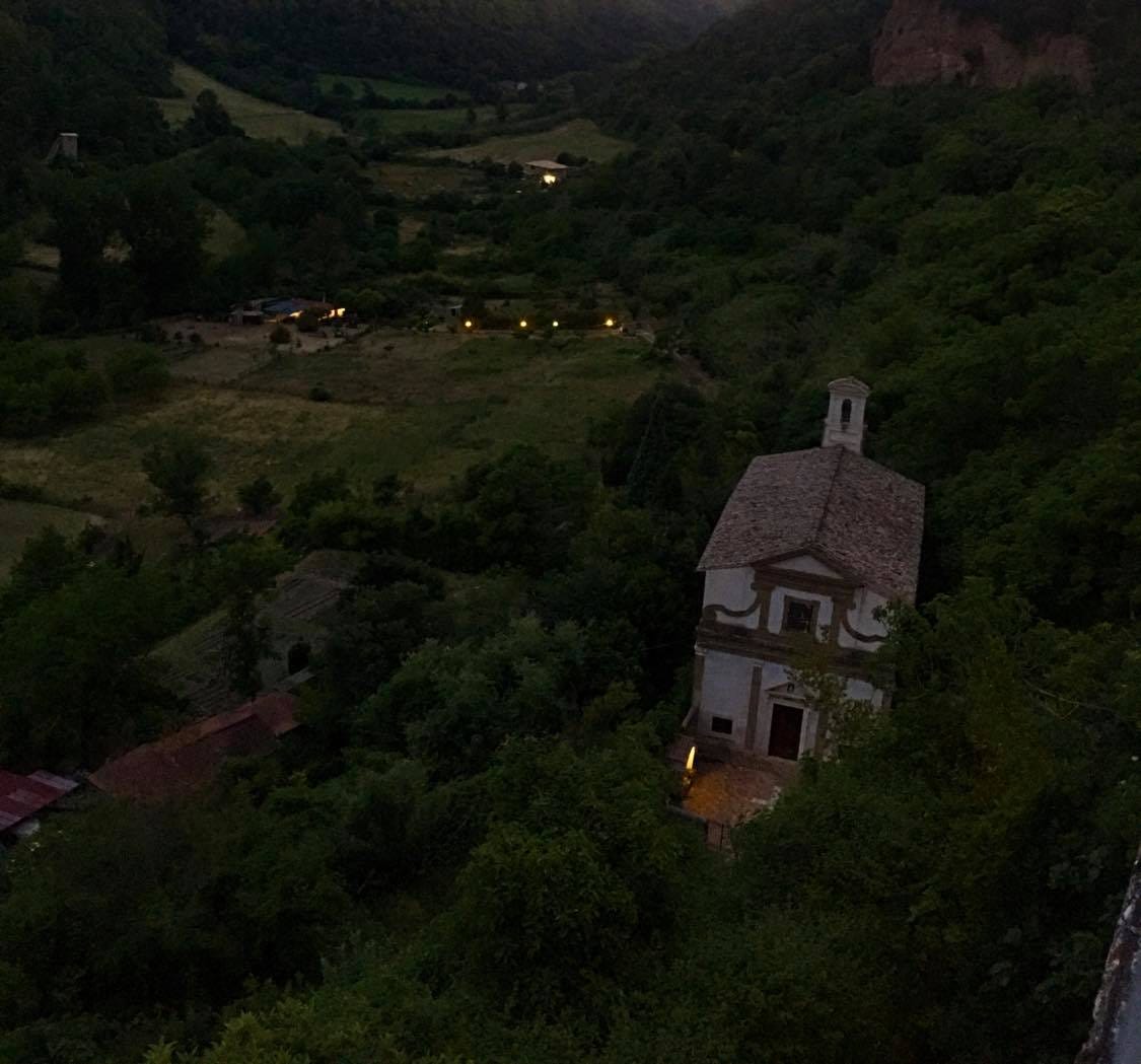 An abandoned church that sits at the bottom of a valley in Civita Castellana. The light you see in front is from a shrine.