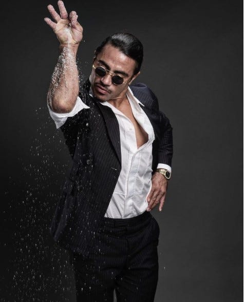 For reasons that continue to elude me, Salt Bae, whose real name is Nusret Gökçe, the son of a Kurdish immigrant who grew up in Turkey, is now worth 60 million dollars. This man, by some mysterious alchemy, has managed to parlay his popularity from this video into a chain of luxe steak houses that span the globe: Ankara, Bodrum, Istanbul and Marmaris in Turkey; Mykonos in Greece; Miami, New York, Boston, Dallas, and Beverly Hills in the United States; London in the U.K.; Abu Dhabi and Dubai in the United Arab Emirates; Doha in Qatar; and Jeddah in Saudi Arabia.