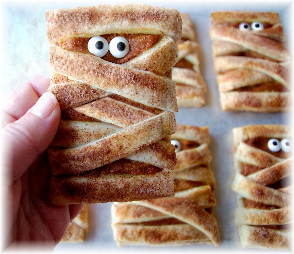 With that in mind, let me share with you a recipe for Mummy Pies that I used to make for my own crumb snatchers. Even adults are so charmed by them, Mummy Pies are the first to go at any party. They’re worth the effort, especially if you enjoy baking, and who among us is impervious to this much cute?