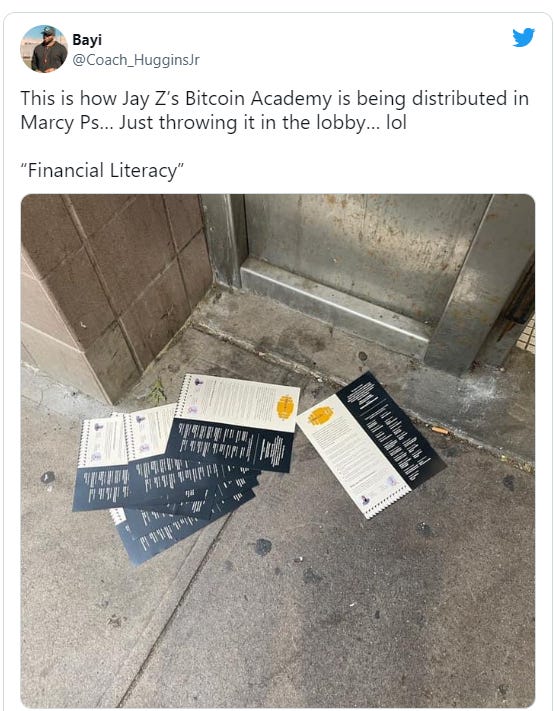 One possible explanation for his behavior: the road to hell is paved with good intentions. Other possible explanation for his behavior: like so many other celebrities, Jay-Z jumped on the crypto bandwagon and has no problem bilking the poor to further his own financial aims, while at the same time hoping to come across as a man of the people. Likeliest explanation for his behavior: he’s forgotten that when you’re desperately trying to feed a family and keep your head above water, you don’t have money to throw down a shithole like crypto.