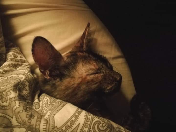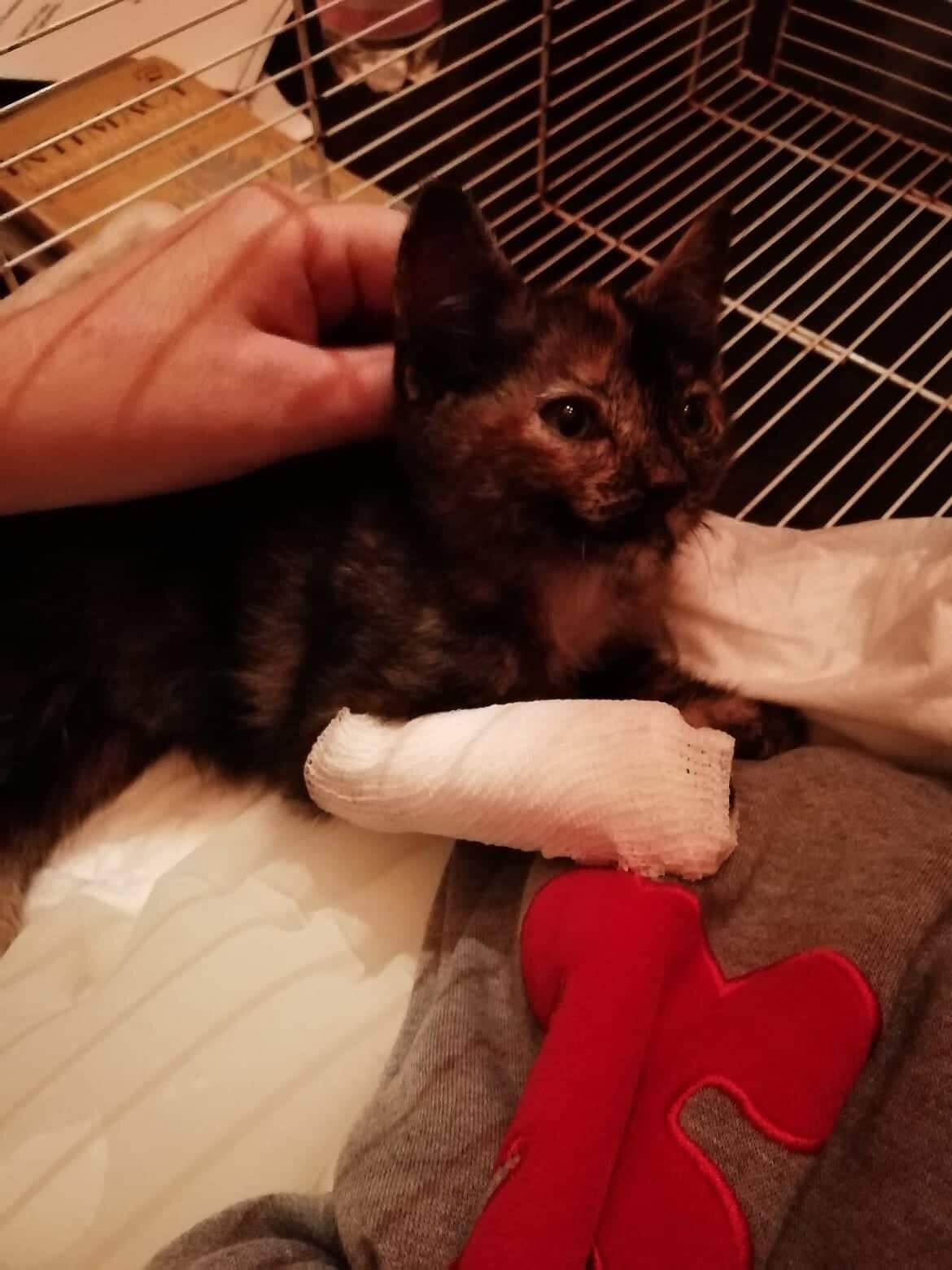 The vet brought us back to his office. In his rippling Italian, he explained that the four-month-old kitty (a she-kitty, by the way, female like most torties) had a broken leg, severed at the hip. Her front paw was bandaged where they’d enclosed a tiny pouch of IV fluids. He didn’t know if she would make it, but kittens tended to heal quickly. Unfortunately, the clinic wasn’t equipped to handle overnight patients.