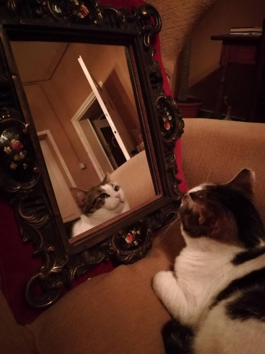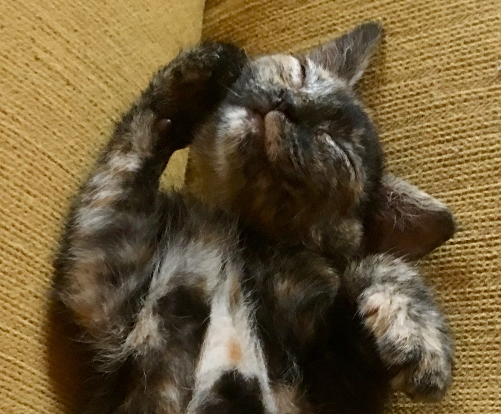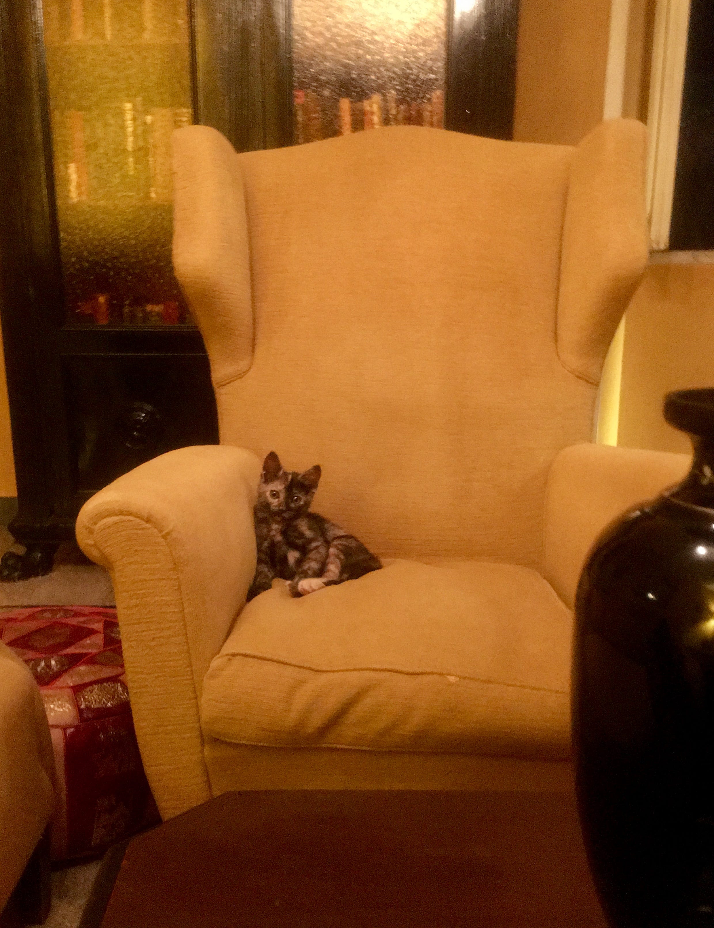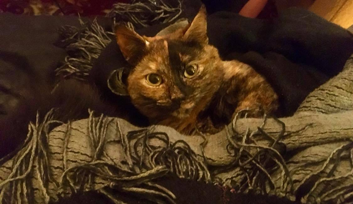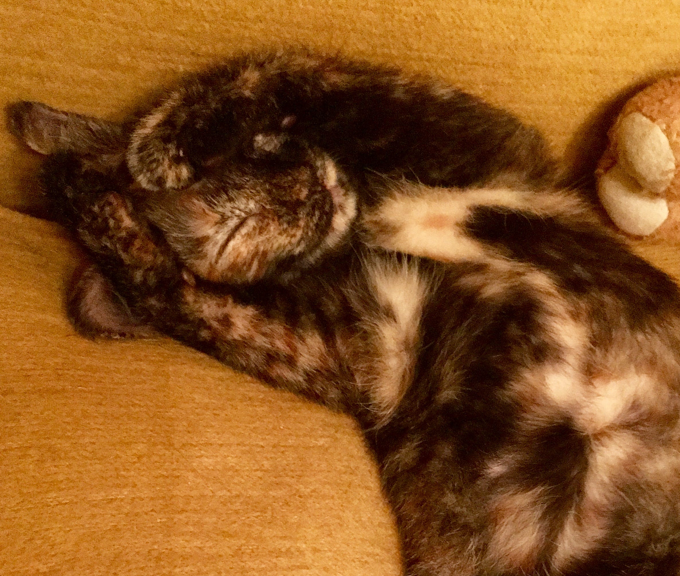 Yet she was alive. And I was already in love with her. Torties look like baby monkeys when they’re kittens; only later do they come into their lush beautiful colors. This monkey gazed up at me and John so trustingly; we were both hopelessly smitten.