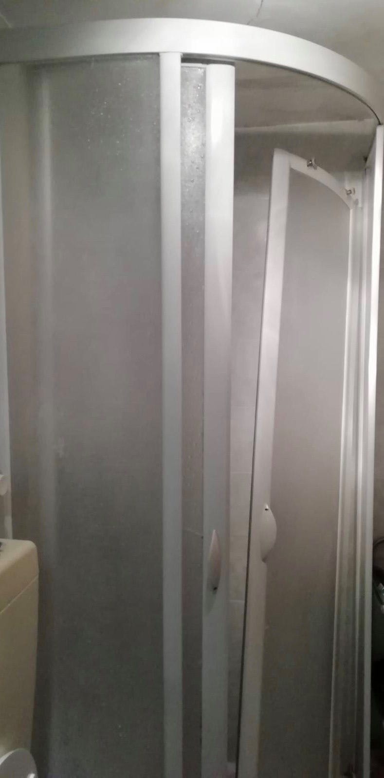 One night, Olive got stuck in the shower (she loves the shower) and heard John opening a can of food. Here’s what the shower door looks like now.
