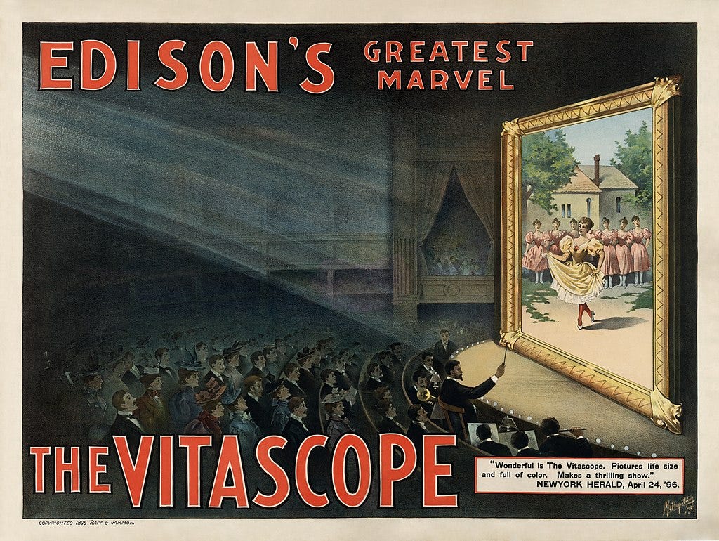 The first indoor theater in the United States dedicated to showing movies opened in 1896. It was in New Orleans and called Vitascope Hall, named after the projector it used: Edison’s Vitascope. Much like everything else Edison “invented,” it was actually created by somebody else, in this case Charles Francis Jenkins and Thomas Armat. The men soon fell out with one another. Jenkins sold his interest to Armat; Armat sold both his and Jenkins’ interests to Edison.